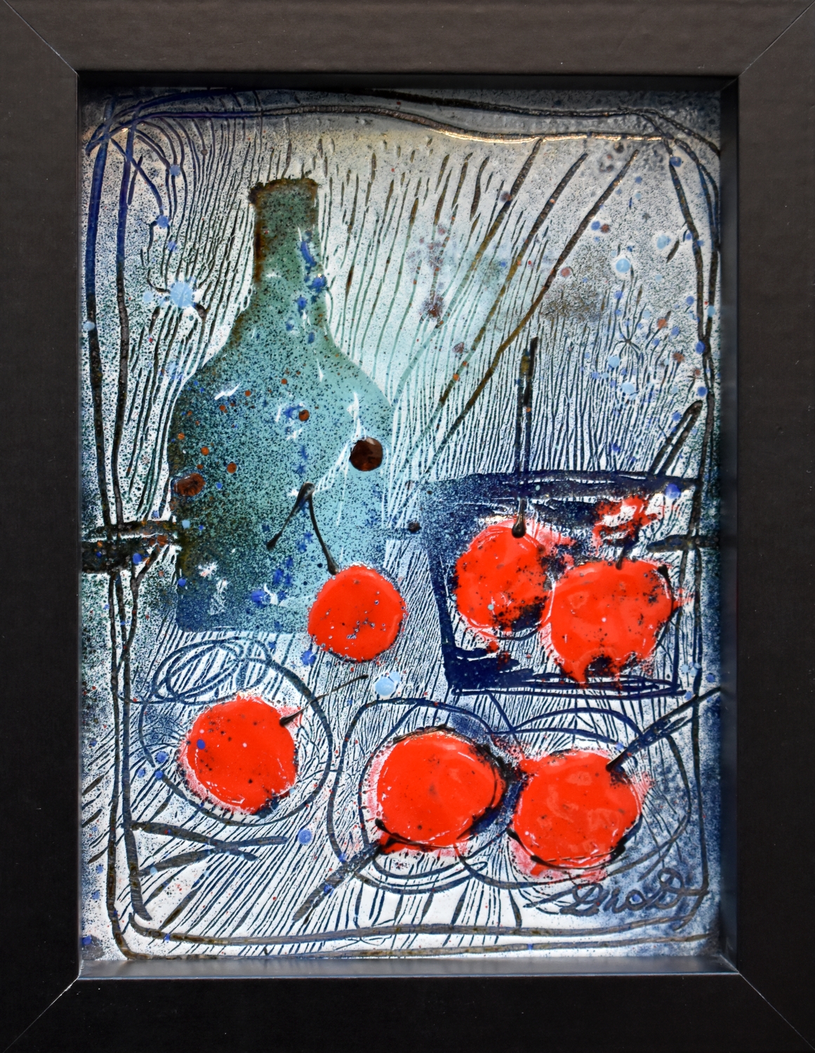 Still Life with Six Cherries and a Bottle, 2024, copper, enamel, 22.5x18 cm, 1/1