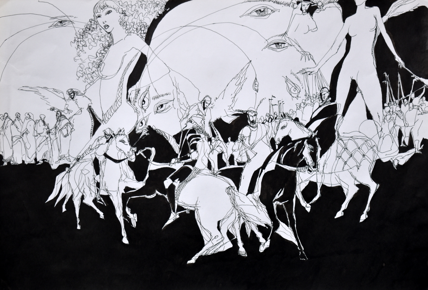Mythology. V. Eigirdas, perhaps the only painter in Lithuania, gave a sharp expression to the religious theses of Christianity. Rejecting the common, banal, reportage retelling of biblical themes, he interprets fragments of Old Testament prophecies, sentences that evoke associations. In other words, he creates a pictorial myth based on an unconventional approach to canonical things. Therefore, it is not surprising that the images are full of creepy, mystical scenes, surrealistic constructions connecting people and demons, and symbols. Despite the painterly changes, the relationship between "good and evil", "light and darkness" in the paintings remains constant until the most recent works. Seductive, lustful poses of naked women, real vessels of sin, characters splashing with fire and sword, horned, bloody beings of a unified spirit - everything boils in one cauldron of creation. The prophecies of Ezekiel, the revelation of the Gospel of St. John and other rich multifaceted themes become a constant, inexhaustible source of creativity. Let us not forget that biblical texts, studded with metaphors and allegories, are complex in themselves. They speak a different dialect to everyone. Therefore, the artist does not bother with deciphering, he simply reveals the perceived information through color and form.