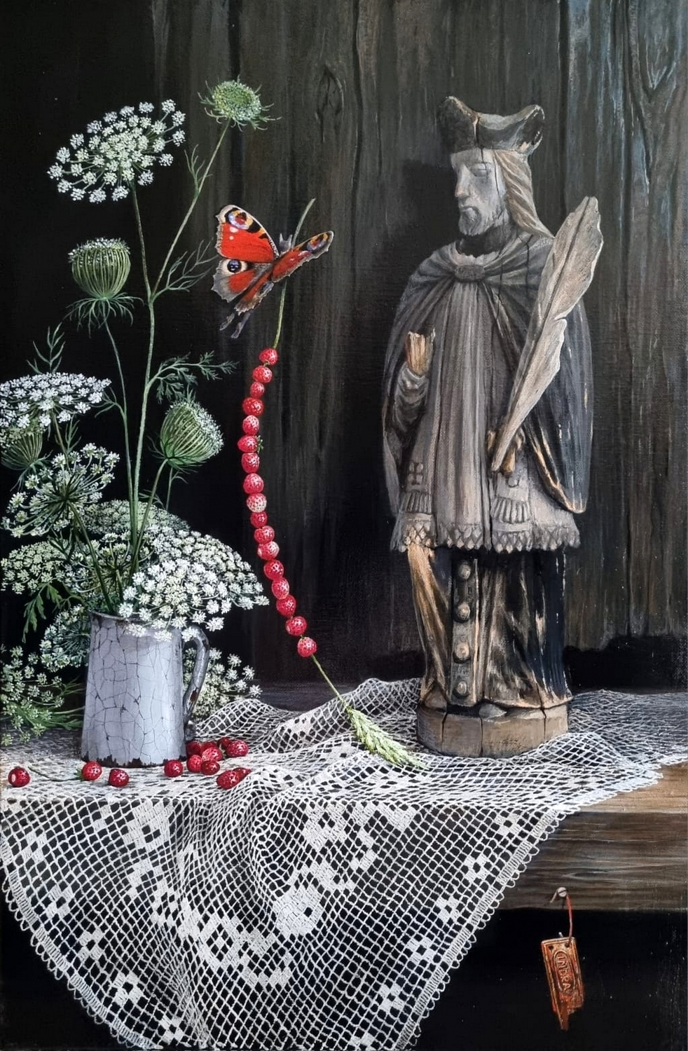 The precise, clear and secure picture exactly meets the point, while masterfully defining the silhouettes of the characters as if inhabited in these gorgeous frames. It freezes them, protects from the nervous uproar and eternal rush. Physical shape of objects, successfully recovered by tiny touches of the brush as well as the glitter of jewelry and print of the texture, but especially the sophisticated image charades – that is what makes the paintings of Indra Grušaitė the colorful, alluring and perhaps even embarrassing dreams about the beauty. Dream about the beauty are the subject for modern human being to long for in this eternal rush and constant failure to manage the time.
