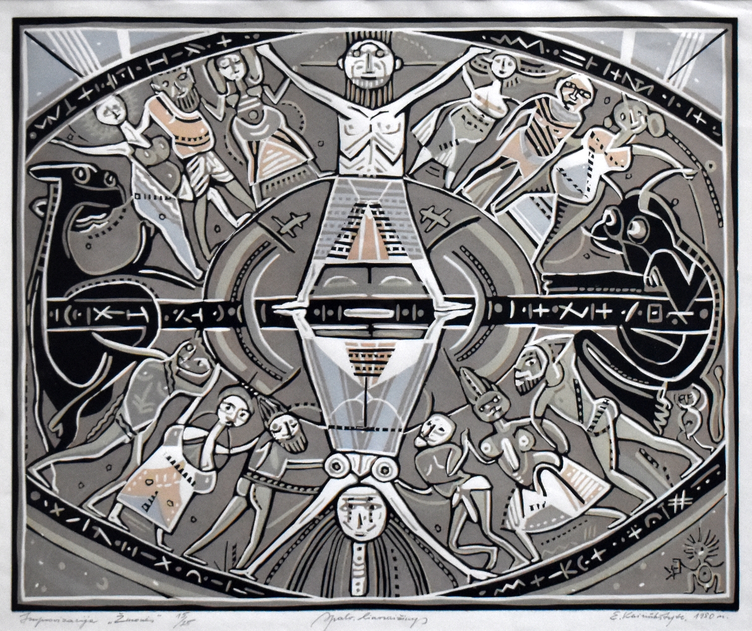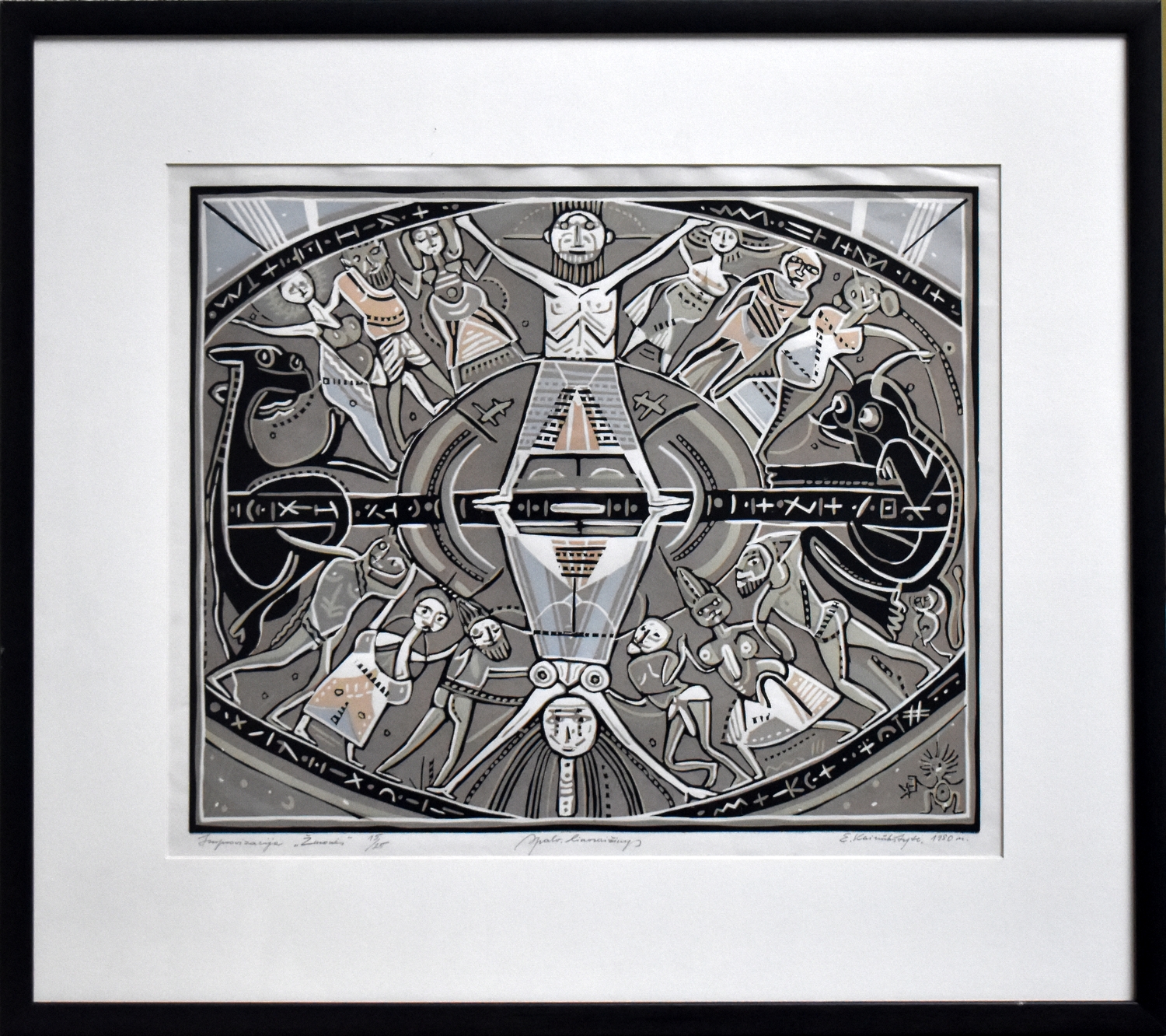 Improvizacija. Žmonės, spalvotas lino raižinys, 15/25 , 44x54 cm, rėmas 70x79 cm