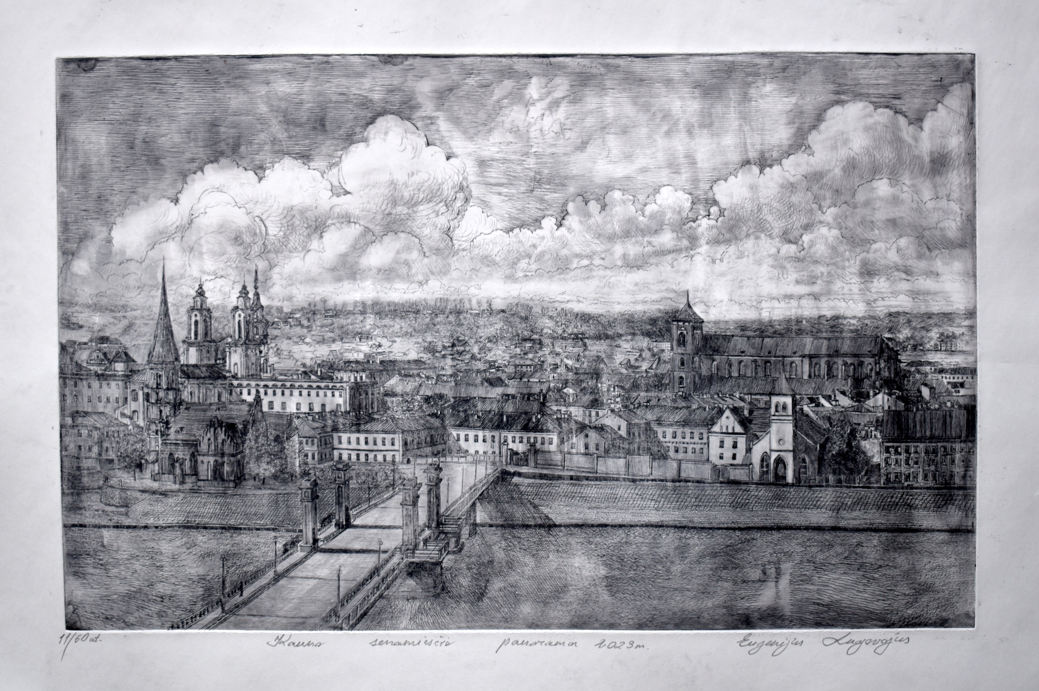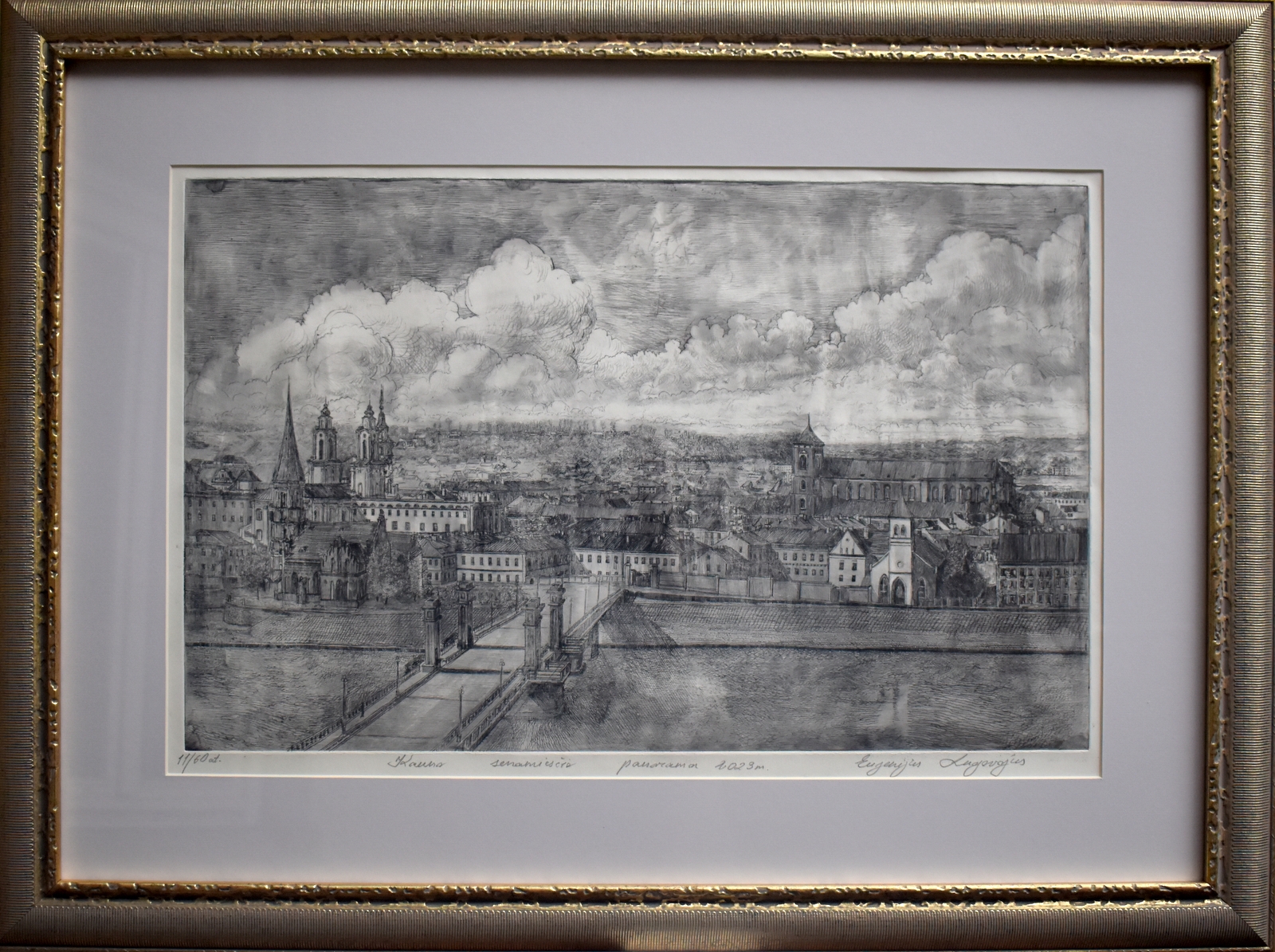 Kauno senamiesčio panorama, 2023, sausa adata, ofortas, 49x64 cm 11/60, rėmas 68x91 cm