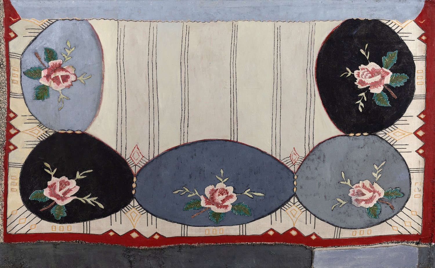 O kas po mano sodelį vaikščiojo?, 2018, sena siuvinėta drobė, aliejus, 70x112 cm