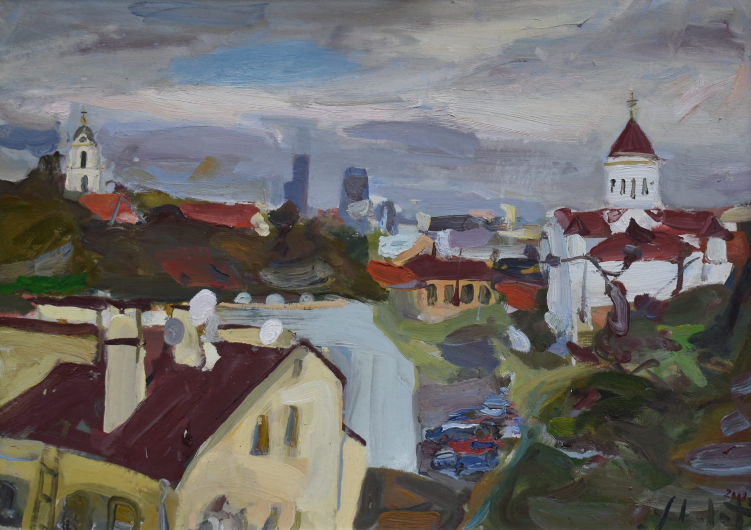 Peizažas su šv. Jonų bažnyčios bokštu, 2008, kartonas, aliejus, 50x70 cm,